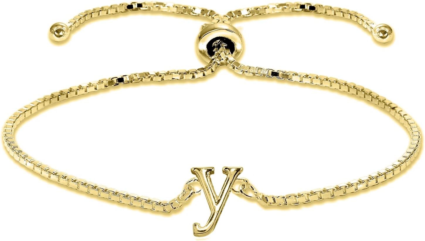 Wear this stylish bolo pull-apart adjustable bracelet to enhance your daytime and evening attire. This classic initial features a polished alphabet letter, perfect as a dainty bracelet for all. This letter bracelet is adjustable to fit your wrist from 3 to 10 inches. It is crafted of fine yellow gold flashed sterling. This trendy bracelet in fine jewelry is a great addition to your sterling silver jewelry, gold jewelry and personalized jewelry collections. It can be purchased as gifts for women.