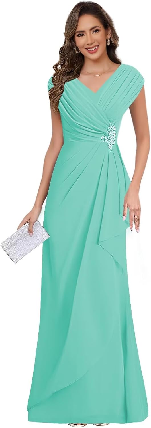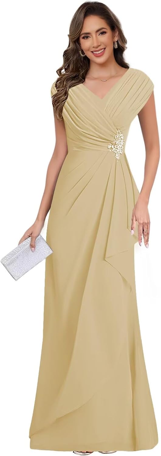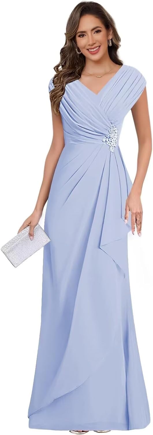 FUMY Cap Sleeves V Neck Mother of The Bride Dresses for Women Pleated Chiffon Wedding Guest Dress FM008