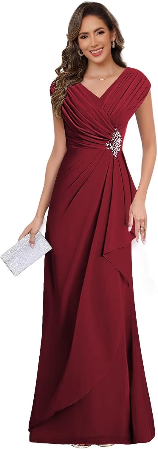 • This stunning floor-length gown features a flattering V-neckline and delicate pleating that drapes beautifully across the body, creating a timeless and sophisticated silhouette. The cap sleeves add a touch of elegance, making it perfect for mother of the bride/groom, formal dinners, weddings, or any black-tie event where you want to make a lasting impression.