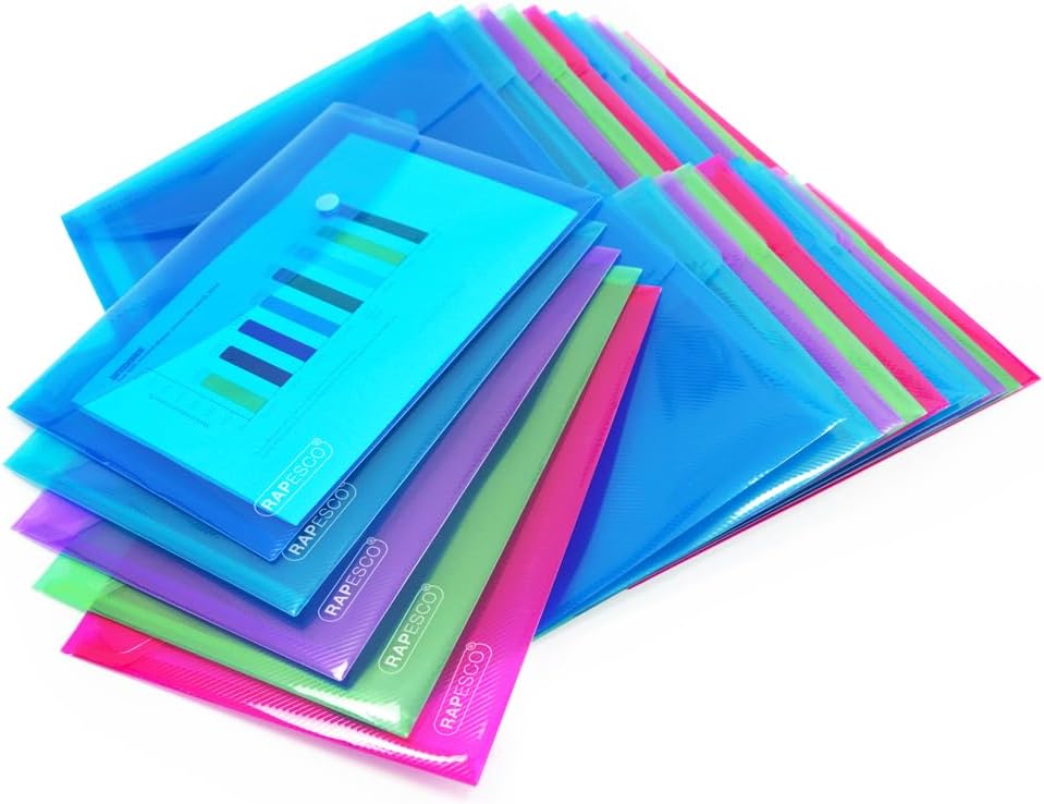 These A5 plastic popper wallets are made from crystal clear, transparent, durable polypropylene material for easy organisation of documents. Featuring a smart white press-stud closure on the curved fold-over flaps, these folders keep contents safe and secure making them useful as a general storage file for keeping loose papers together at the office, home or on the move. Featuring a handy pen holder cut out under the curved flap and a large capacity of 75 sheets of 80gsm paper up to A5 in size, these files come in convenient packs of 25.