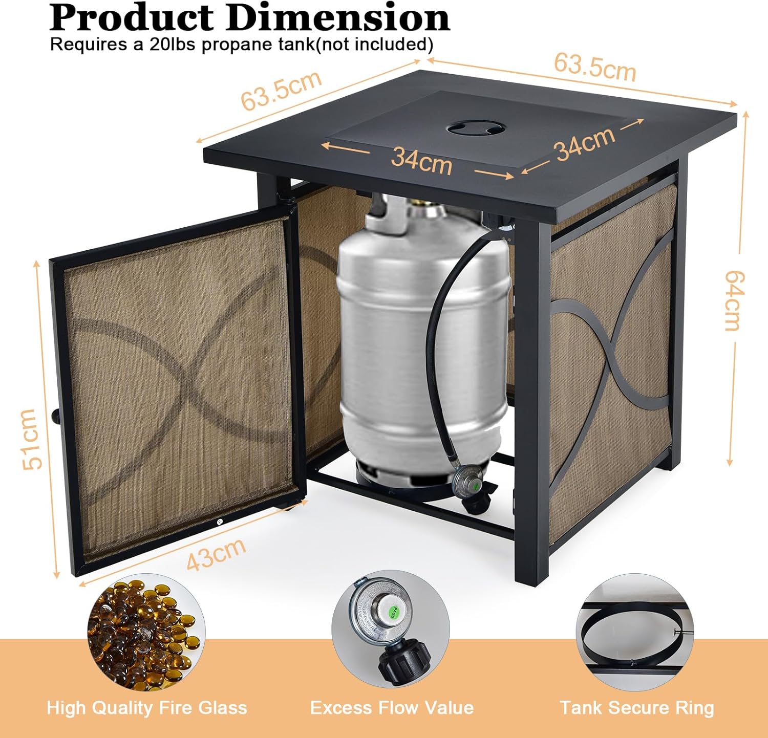 Specification:Color: Black, CoffeeMaterial: Metal, Stainless Steel, FabricOverall Dimension: 25" x 25" x 25"/63.5 x 63.5 x 64 cm (L x W x H)Size of Fire Bowl: 13.5" x 13.5"/34.5 x 34.5 cm (L x W)Net Weight: 36 lbs/16.5 kgOutput: 40000 BTUPackage Includes:1 x Outdoor Fire Table1 x Fire Glass 1 x AAA Battery1 x Instruction