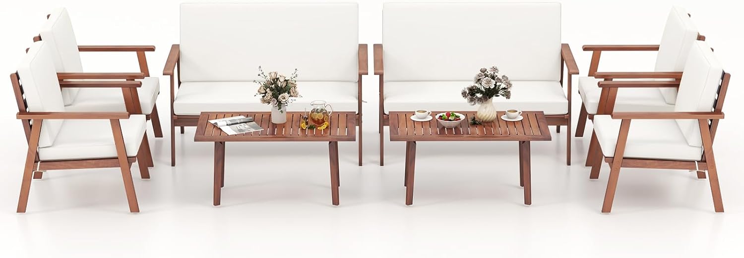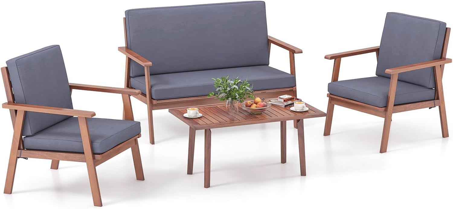 DescriptionExperience optimal comfort with this 4-piece acacia wood patio furniture set. The loveseat and single sofas are equipped with seat and back cushions filled with high-density fillings, providing a cozy and relaxing sitting feeling. The cushion covers are easily removable with convenient zippers for maintenance. Moreover, the main frame of the furniture set is made of high-strength acacia wood, offering stability, resistance to deformation, and natural elegance. The inclined backrests and armrests of the loveseat and single chairs enhance the overall comfort, while the reinforced cross bars ensure durability. Arrange the loveseat, two single chairs, and coffee table to fit your desired outdoor space, making it perfect for your backyard, poolside, or front porch. Elevate your outdoor experience with our versatile and stylish patio furniture set.FeatureHigh-density filled cushions for optimal comfortConvenient zippers for easy maintenance of cushion coversStrong and durable acacia wood frame for high stabilityInclined backrest and cozy armrests offer added cozinessReinforced cross bars for enhanced structural stabilityFreely arrange each piece to fit your spaceIdeal for outdoor areas such as the backyard or poolsideEasy assembly with clear instructions and complete accessoriesPlease avoid rain exposure for long service lifeSpecificationColor of Frame: NaturalColor of Cushion: Off White/GrayMaterial: Acacia Wood, Polyester, Spray-Bonded Non-Woven Fabric, SpongeDimension of Loveseat: 48.5” x 27” x 32”(L x W x H)Dimension of Each Chair: 26.5” x 27” x 32”L x W x H)Dimension of Coffee Table: 35.5” x 20” x 17”(L x W x H)Seat Height from the Ground: 13”Dimension of Long Seat Cushion: 44” x 20.5” x 3.5”(L x W x Thickness)Dimension of Long Back Cushion: 44” x 18” x 2”(L x W x Thickness)Dimension of Small Seat Cushion: 22” x 20.5” x 3.5”(L x W x Thickness)Dimension of Small Back Cushion: 22” x 18” x 2”(L x W x Thickness)Weight Capacity of Loveseat: 720 lbsWeight Capacity of Each Chair: 360 lbsWeight Capacity of Tabletop: 165 lbsTotal Net Weight: 94 lbsPackage Includes:1 x Loveseat2 x Single Chairs1 x Long Seat Cushion1 x Long Back Cushion1 x Small Seat Cushion1 x Small Back Cushion1 x Coffee Table1 x Instruction